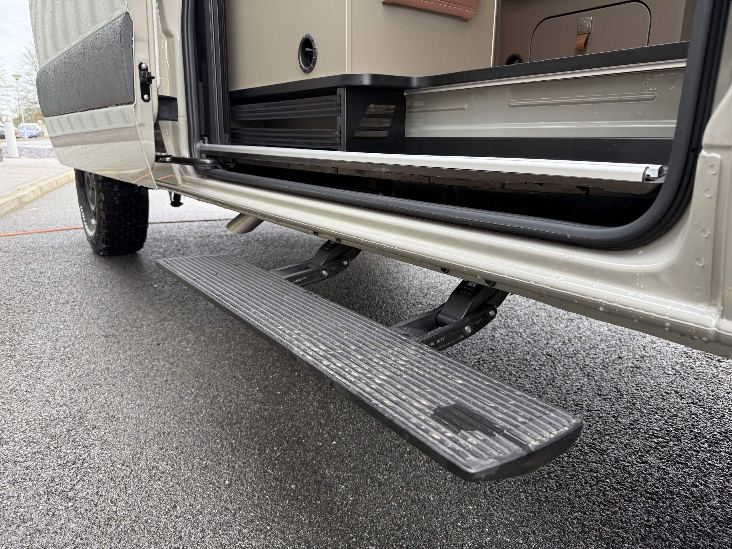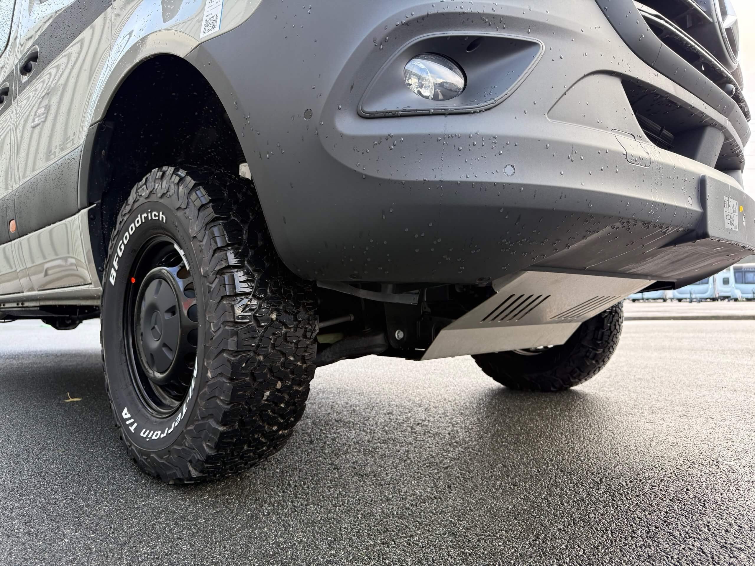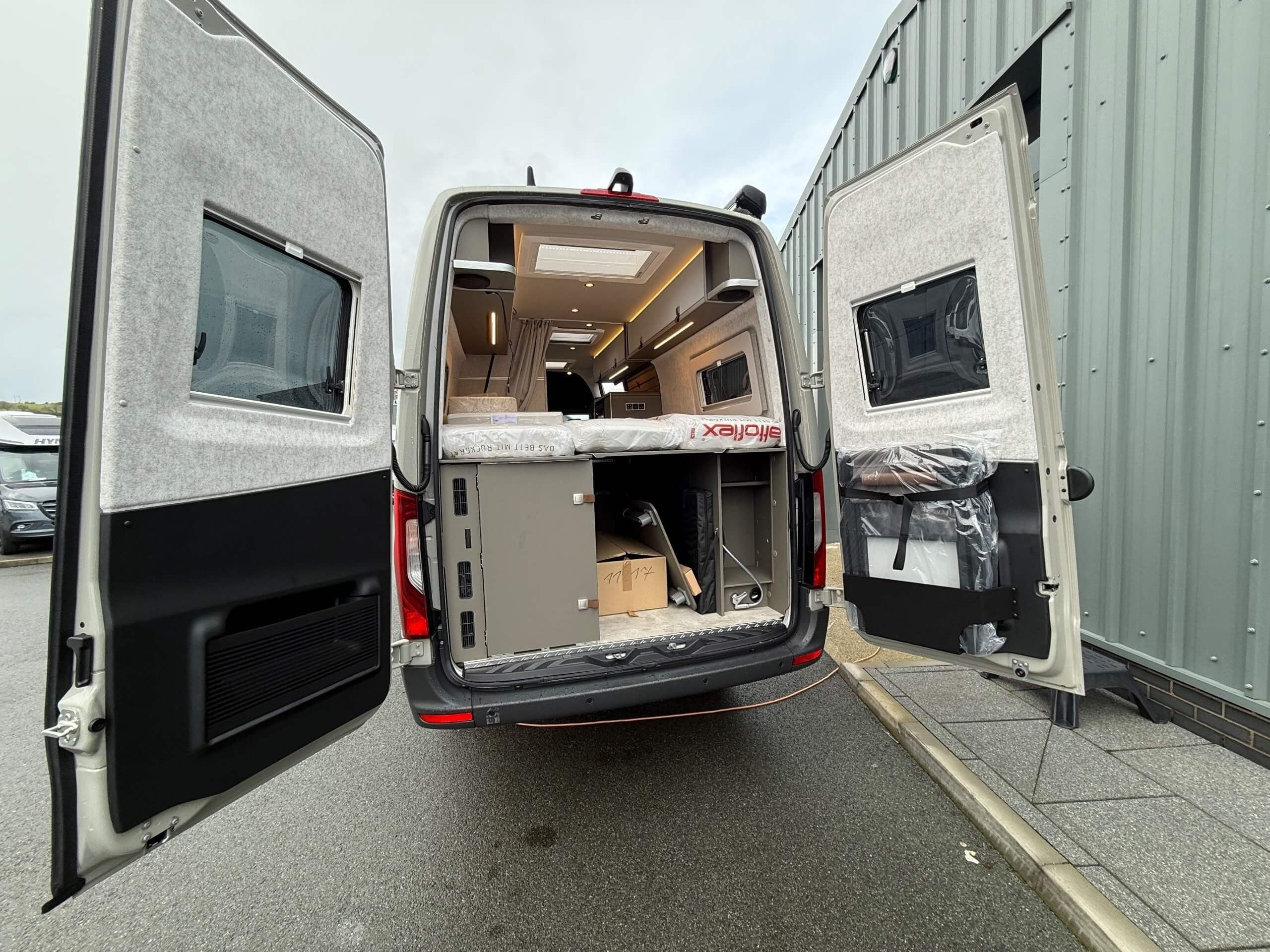 Specs • Mercedes Benz CV 419CDI • 190bhp • Emission standard-Euro VI-E • 4x4 • Tyres-St.245/75/R16C/6.5J l. • High-beam assist-Auto. dimming • Rims optics-Black • Windscreen el. heated • Chassis paint- Stonegrey 7030 • RH CV sliding door: Electric closing aid • Seat heating driver & passenger • Cab parking heater-w r/c • Underride protection-for all-wheel drive • Furniture decor-Ivy Green • Living Style coll. Moreno • Skylight bedroom-Heki Midi • Fog headlamps-w corn. light • Entrance step-electric offroad step • Isofix • Folding chairs and table • Exterior shower • External gas socket • Wet Wiper System • Heating-Truma Combi DE • TV1 Pre-inst. living room • TV unit living space-22" • Drinking water filter • Additional cushion SG-Yes - Bed conversion for seating group incl. additional cushion • Design sticker-Carbon line • Awning length 4.25m • Awning colour-Anthracite • Suspendable table Autonomy package-Lithium Lux 1 PC • Solar panel – 2x85 Watt (with pop-top roof) • Solar panel – 2x95 Watt (without pop-top roof) • Inverter 12V/230V/1300W • 1st hab.battery-160 AH Lithium • 2nd hab.battery-80 AH Lithium • Drinking water filter Living Comfortpackage Grand Canyon S 700 • Ambient lighting • Living S.c. HOME: Pillows&bag • Fitted sheet fixed bed • Shower slats Equipment line premium Camper Van • Radio OEM-MBUX10,25''/Navi/DAB/SPhI/RFK • rear view camera 7"/10.25"MBUX • Steering wheel-in leather • Transmission-Automatic • Adaptive cruise control • Traffic Sign Assist • Smartph.stor.incl.wirel.charg. • Charging pack dashboard • Full LED headlamps • Automatic cab climate control system • Blind spot assist • Park package-with 360° camera -