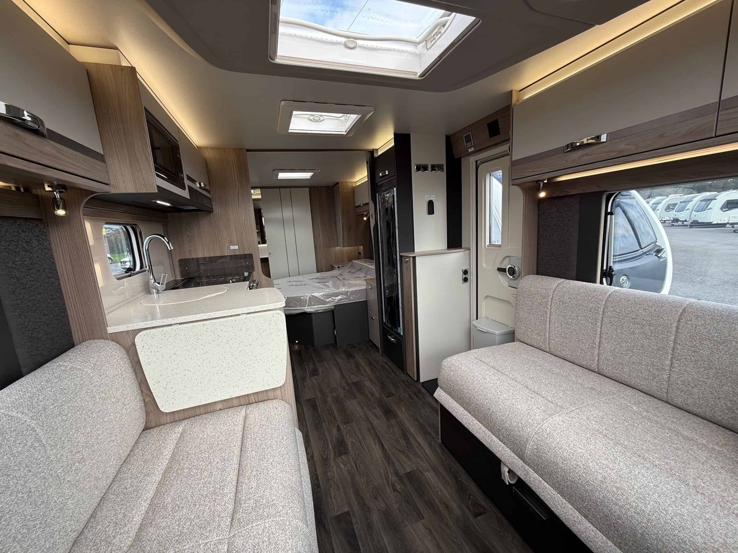 Step inside Conqueror Grande and experience a new level of touring comfort. With its 8ft-wide body, Conqueror Grande gives you extra space where it matters most. From a bright, open front lounge to generous room around the bed for easier movement and added convenience, every detail is designed to make your time away feel effortlessly spacious. Conqueror Grande highlights The Conqueror Grande comes with features that make this range special: • Body width of 8ft for increased living space • External cold water shower and BBQ points • NEW Dometic panoramic front sunroof • NEW sprung seat bases and tri-foam backrests • Solid surface kitchen worktop with flush fitting chopping board & foldaway extension • 120W roof mounted solar panel • Exclusive Duvalay Duvalite Strato mattress • Dual hinged Dometic 133 litre tall slimline fridge with 12 litre removable freezer 3 YEAR WARRANTY 10 YEAR MANAFACTURER-BACKED BODYSHELL WARRANTY -
