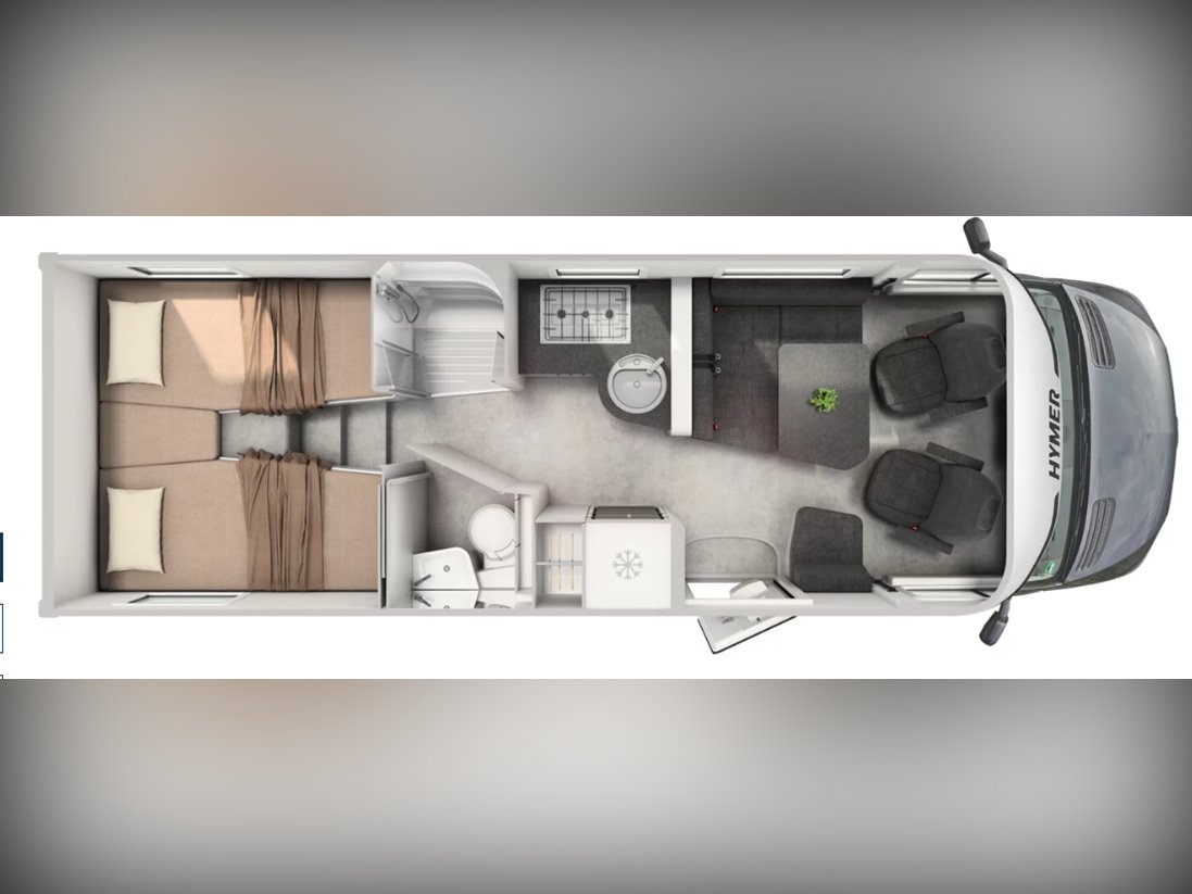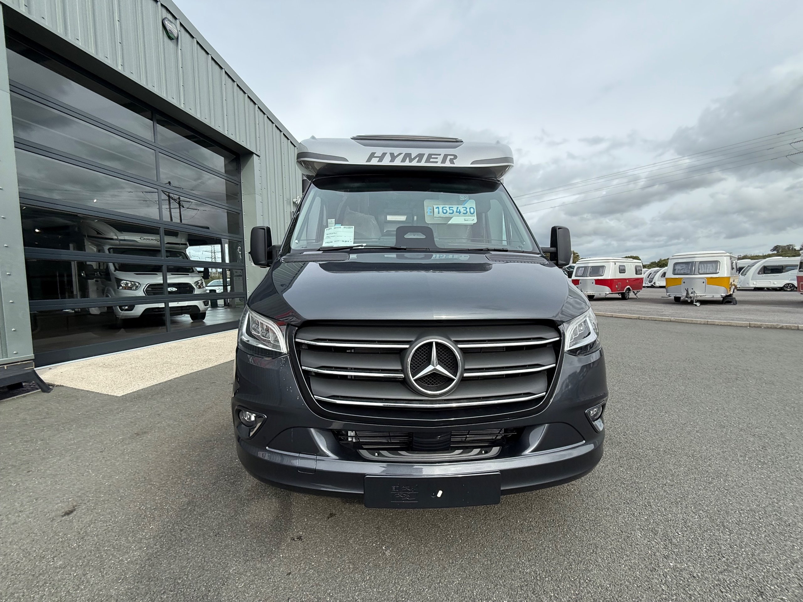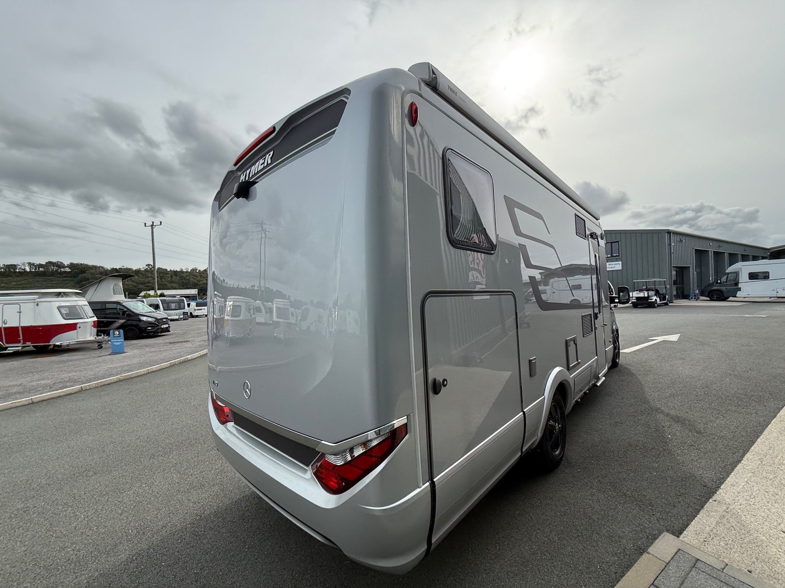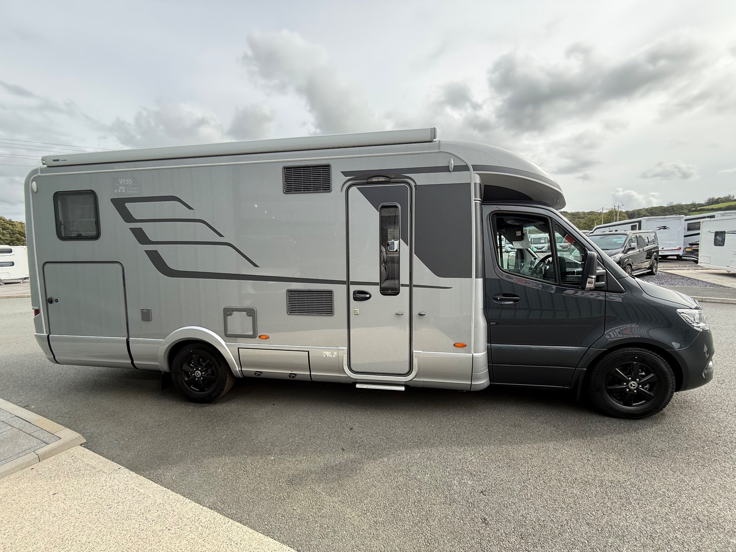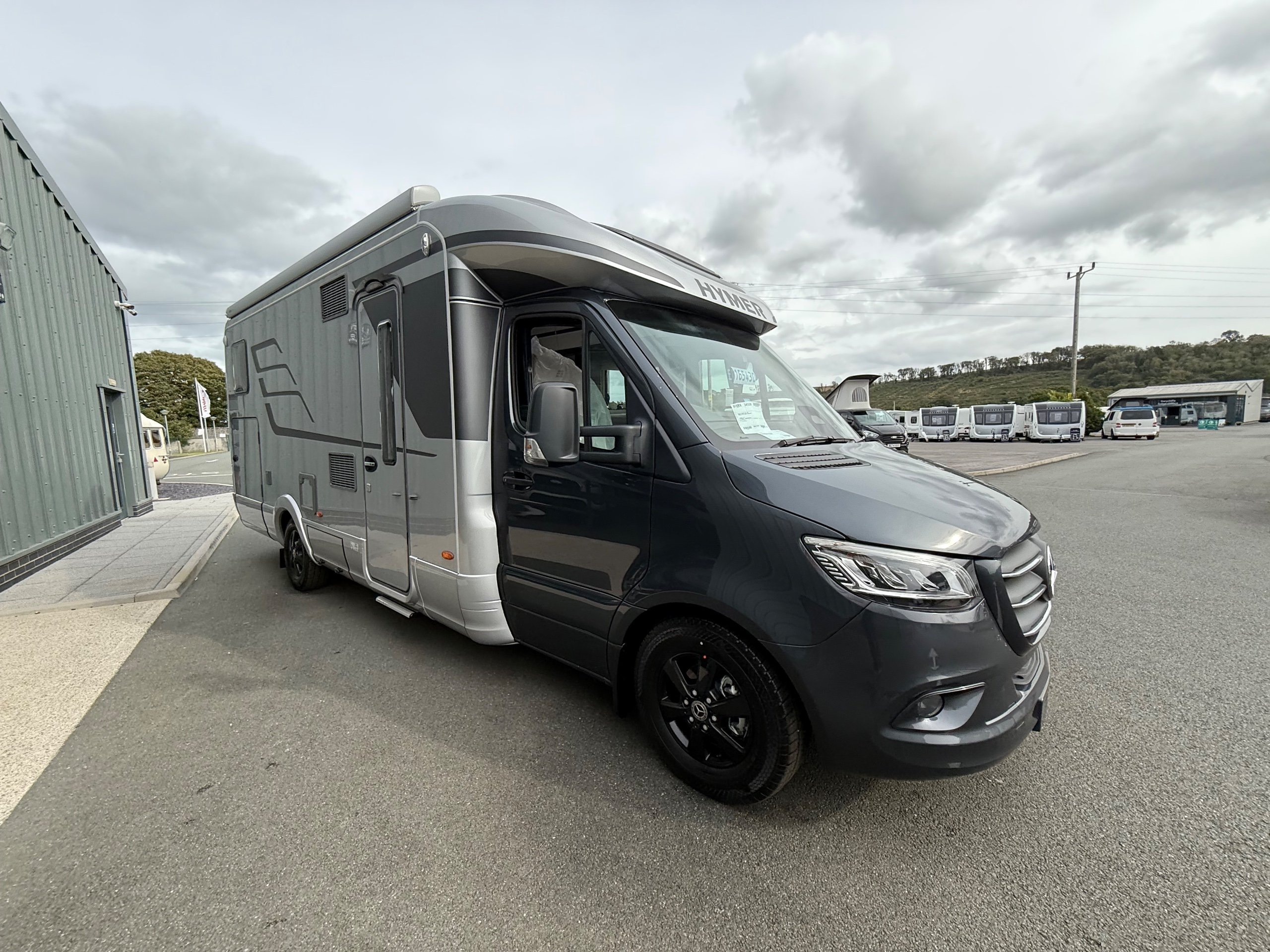 Offering guaranteed quality and technical expertise, the HYMER B-Class MasterLine is setting new standards in the premium segment. As our flagship, it embodies a state-of-the-art body shell design, exclusive design features as well as premium interior furnishings, and creates an all-round generous feeling of space. Following the huge success of the HYMER B-Class MasterLine I, with the HYMER B-ML T we are offering the tried-and-tested features of the luxurious integrated model combined with the exceptional handling characteristics and benefits of a semi-integrated model. Equipped with the nippy Mercedes-Benz chassis cowl, the HYMER B-ML T is the next logical addition to our premium range of motorhomes. Specification • Equipment Line Premium LP • Style package • Living Comfort package • Arctic package • 16" alloy wheels (black) with All Season tyres • 32" LED-TV with built-in speakers, remote control, DVD drive, HYMER Smart • Multimedia system with Bluetooth® (DVB-T / C, DVB-S2), electric bracket as well as receiver • Cab seats, upholstered in living area fabric, swivelling, height- and tilt adjustable with 2 armrests • Carpet: Laguna • Comfort L-shaped seating group with lounge cushions, longitudinal / transverse sliding table and 2 built-in 3-point belts • Comfort jacks, rear (2 units) • Comfort-Plus habitation door incl. closing aid, RFID (keyless) access as well as central locking • Cupholder instead of storage compartment • Drawer and insert tray storage space in seating group • Electric roof vent with function supply and exhaust air at kitchen • Exterior body colour: Crystal-Silver Metallic • Exterior cab colour: Tenorite grey (Metallic) • Four-circuit air suspension (2 axles) • Frame extension incl. 450 kg garage load • Furniture finish: Velvet Ash • Gas filter for automatic gas bottle changeover • HYMER Smart Battery System 2.0 - extension: 2nd habitation battery module 80 Ah LFP incl. additional charger (160 Ah overall capacity) • HYMER panoramic skylight 80 x 50 cm, double-glazed, rear bedroom • Heated windscreen • Mercedes-Benz Sprinter 4.43 t - 417 CDI - 125 KW/170 hp - Euro VI-E • Premium round and extendable table with real wood frame • Roof AirCon, 2,400 W • Roof awning incl. dimmable LED lighting, silver housing, 450 x 300 cm • Security lock for habitation door • Solar panel with solar charge controller (MPPT) and display, 2 x 95 W • TEC-Tower (153 l fridge/freezer unit, oven) • Textile leather-/ fabric combination: Marquis • Weight variant 4,500 kg (Mercedes-Benz Sprinter 415 / 417 CDI only) -