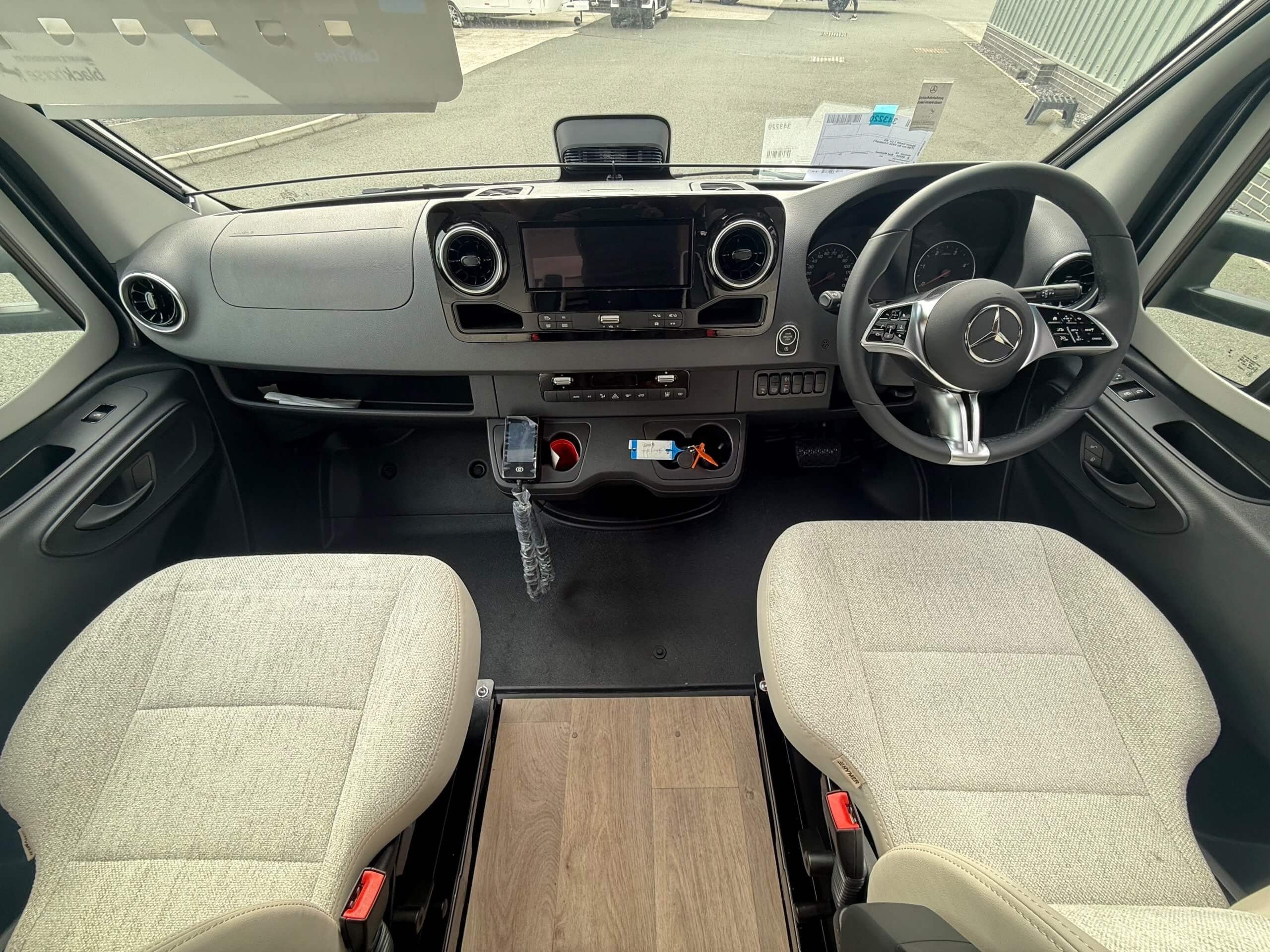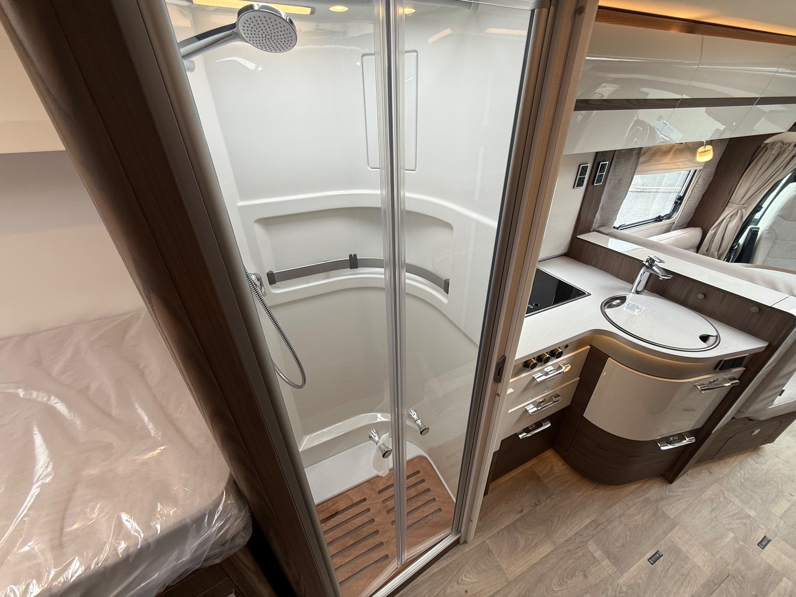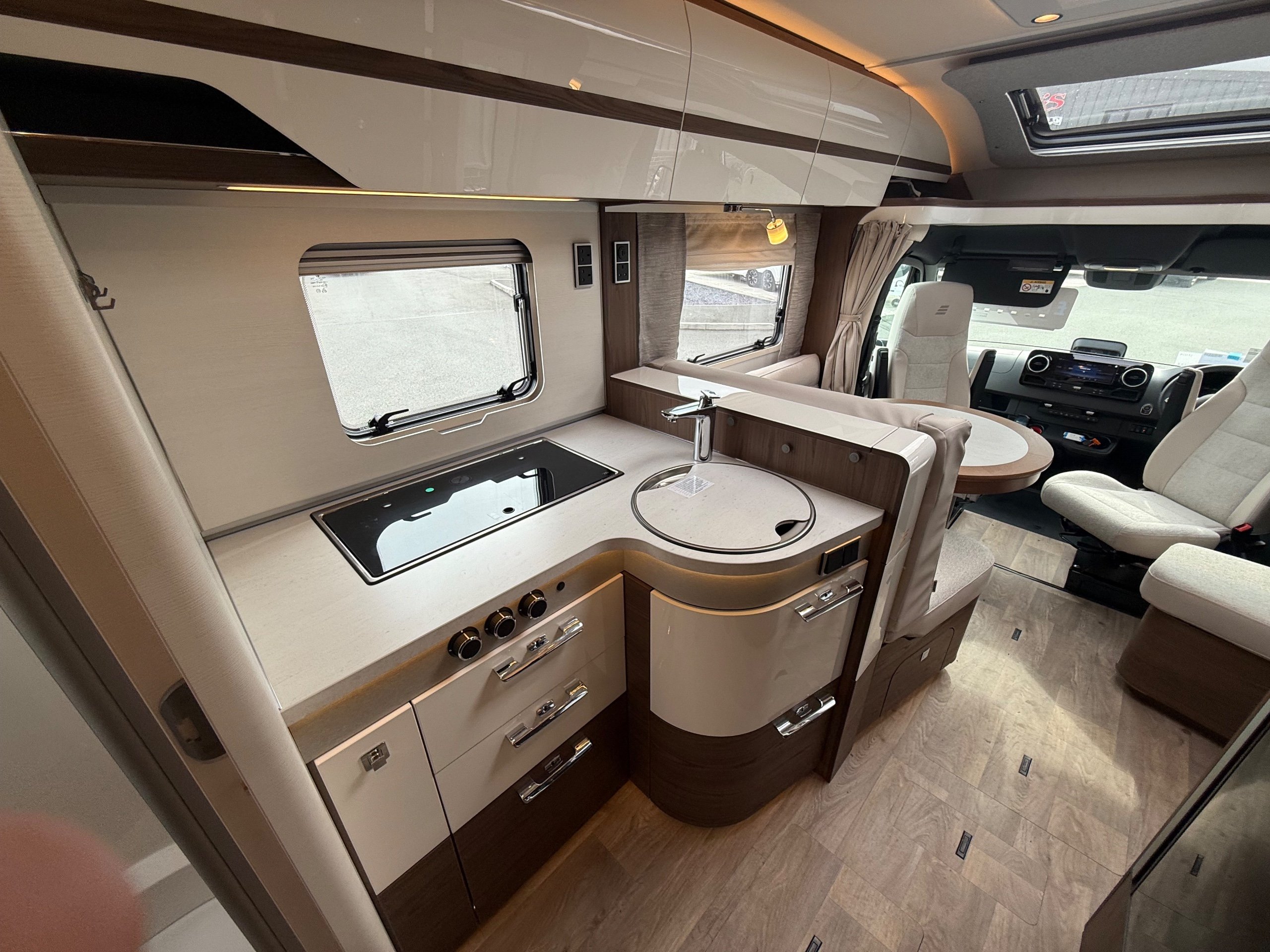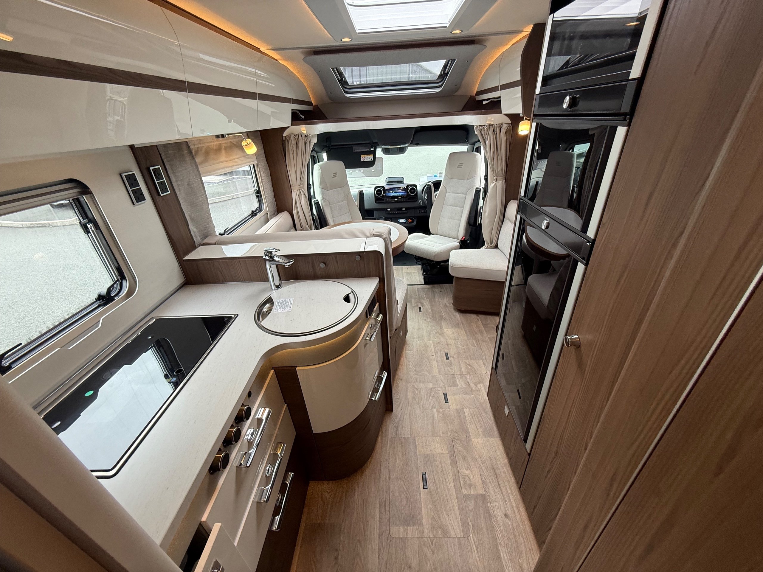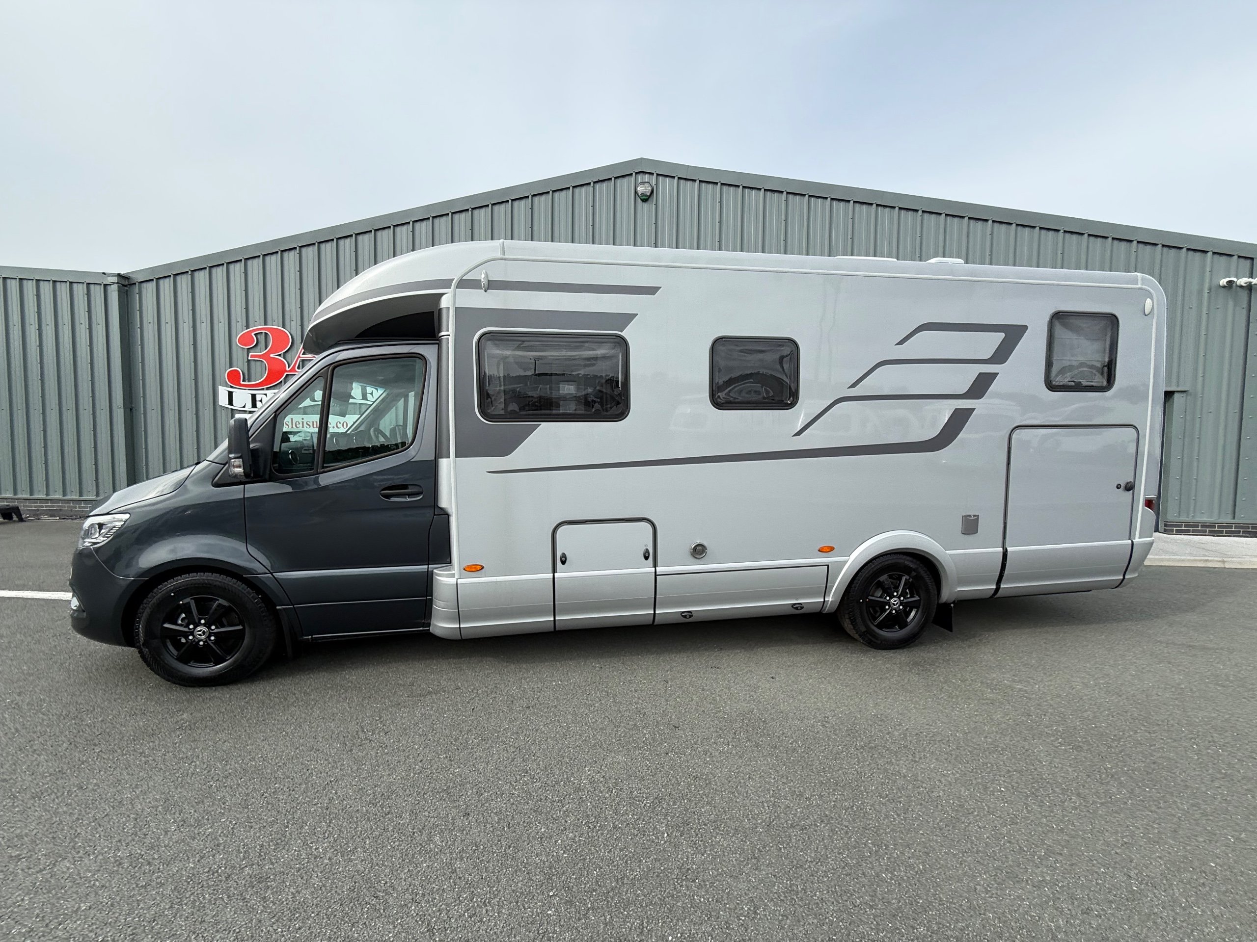 Offering guaranteed quality and technical expertise, the HYMER B-Class MasterLine is setting new standards in the premium segment. As our flagship, it embodies a state-of-the-art body shell design, exclusive design features as well as premium interior furnishings, and creates an all-round generous feeling of space. Following the huge success of the HYMER B-Class MasterLine I, with the HYMER B-ML T we are offering the tried-and-tested features of the luxurious integrated model combined with the exceptional handling characteristics and benefits of a semi-integrated model. Equipped with the nippy Mercedes-Benz chassis cowl, the HYMER B-ML T is the next logical addition to our premium range of motorhomes. Specification • Equipment Line Premium LP • Style package • Living Comfort package • Arctic package • 16" alloy wheels (black) with All Season tyres • 32" LED-TV with built-in speakers, remote control, DVD drive, HYMER Smart • Multimedia system with Bluetooth® (DVB-T / C, DVB-S2), electric bracket as well as receiver • Cab seats, upholstered in living area fabric, swivelling, height- and tilt adjustable with 2 armrests • Carpet: Laguna • Comfort L-shaped seating group with lounge cushions, longitudinal / transverse sliding table and 2 built-in 3-point belts • Comfort jacks, rear (2 units) • Comfort-Plus habitation door incl. closing aid, RFID (keyless) access as well as central locking • Cupholder instead of storage compartment • Drawer and insert tray storage space in seating group • Electric roof vent with function supply and exhaust air at kitchen • Exterior body colour: Crystal-Silver Metallic • Exterior cab colour: Tenorite grey (Metallic) • Four-circuit air suspension (2 axles) • Frame extension incl. 450 kg garage load • Furniture finish: Velvet Ash • Gas filter for automatic gas bottle changeover • HYMER Smart Battery System 2.0 - extension: 2nd habitation battery module 80 Ah LFP incl. additional charger (160 Ah overall capacity) • HYMER panoramic skylight 80 x 50 cm, double-glazed, rear bedroom • Heated windscreen • Mercedes-Benz Sprinter 4.43 t - 417 CDI - 125 KW/170 hp - Euro VI-E • Premium round and extendable table with real wood frame • Roof AirCon, 2,400 W • Roof awning incl. dimmable LED lighting, silver housing, 450 x 300 cm • Security lock for habitation door • Solar panel with solar charge controller (MPPT) and display, 2 x 95 W • TEC-Tower (153 l fridge/freezer unit, oven) • Textile leather-/ fabric combination: Marquis • Weight variant 4,500 kg (Mercedes-Benz Sprinter 415 / 417 CDI only) -