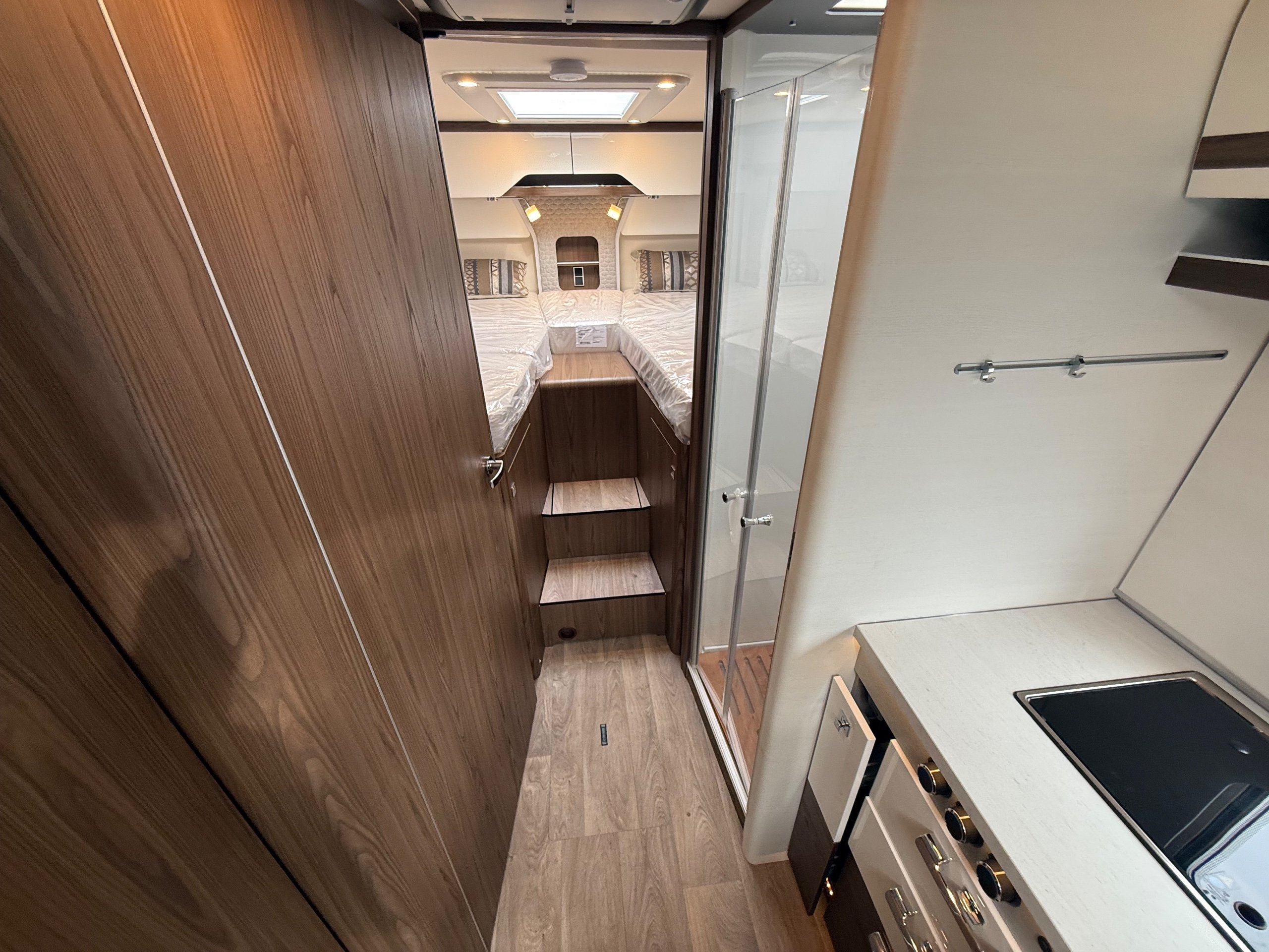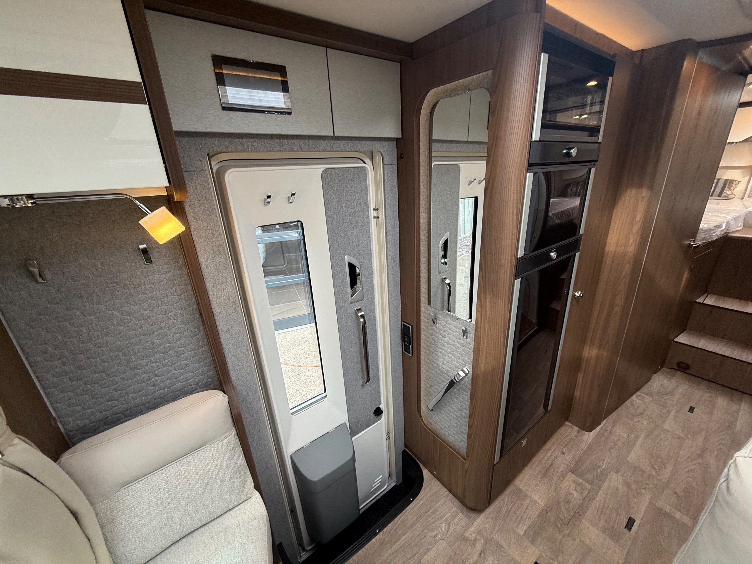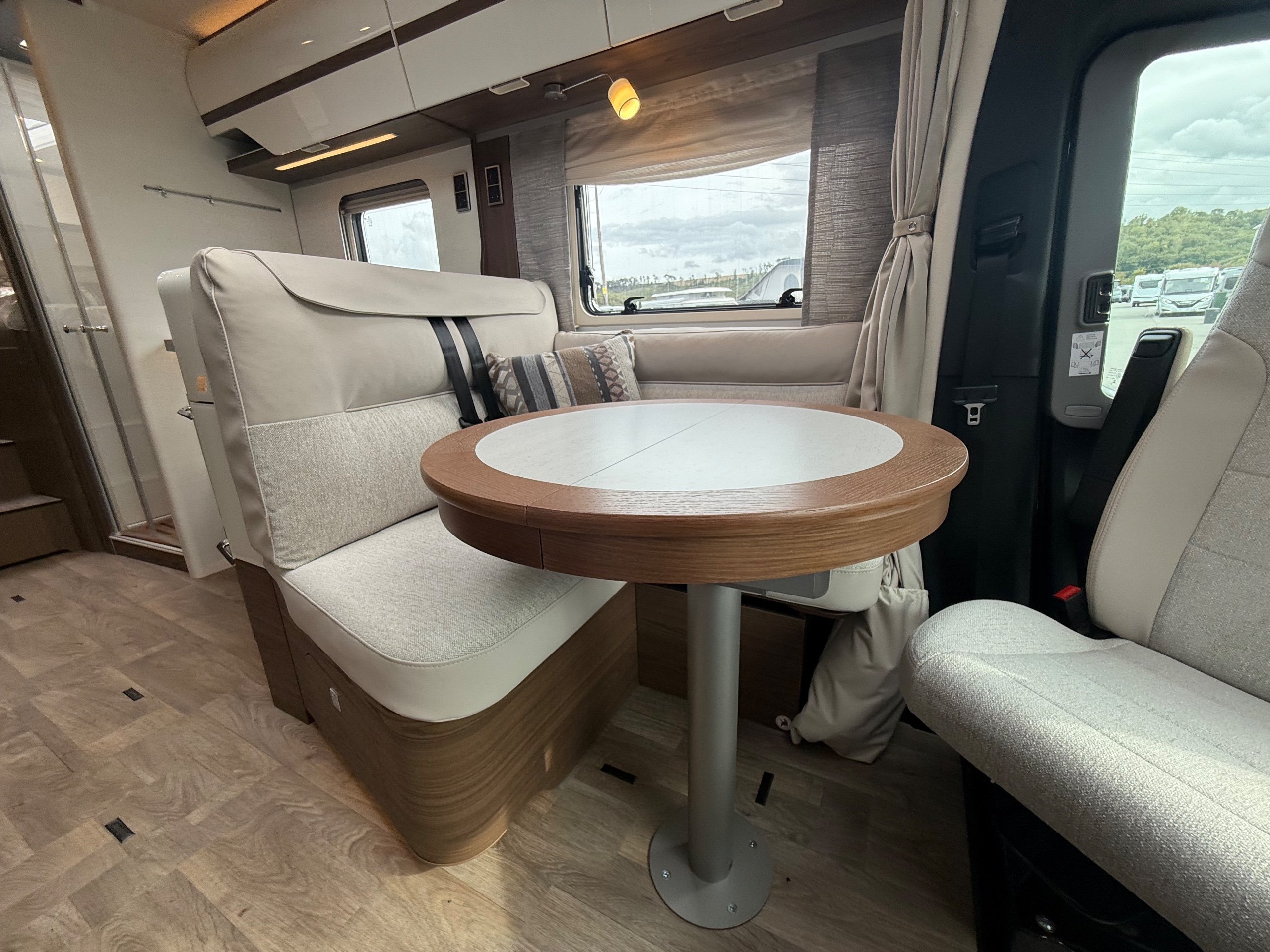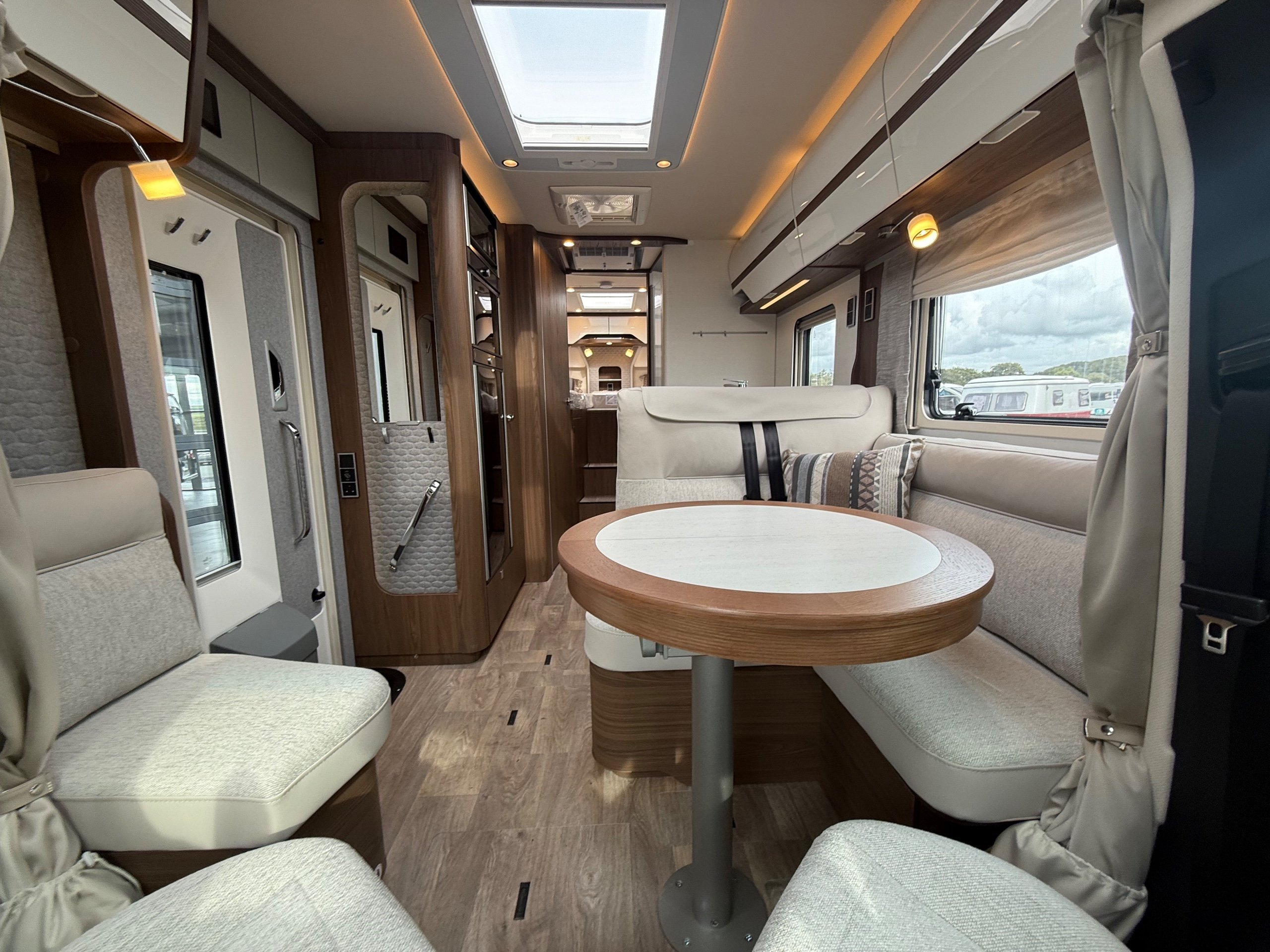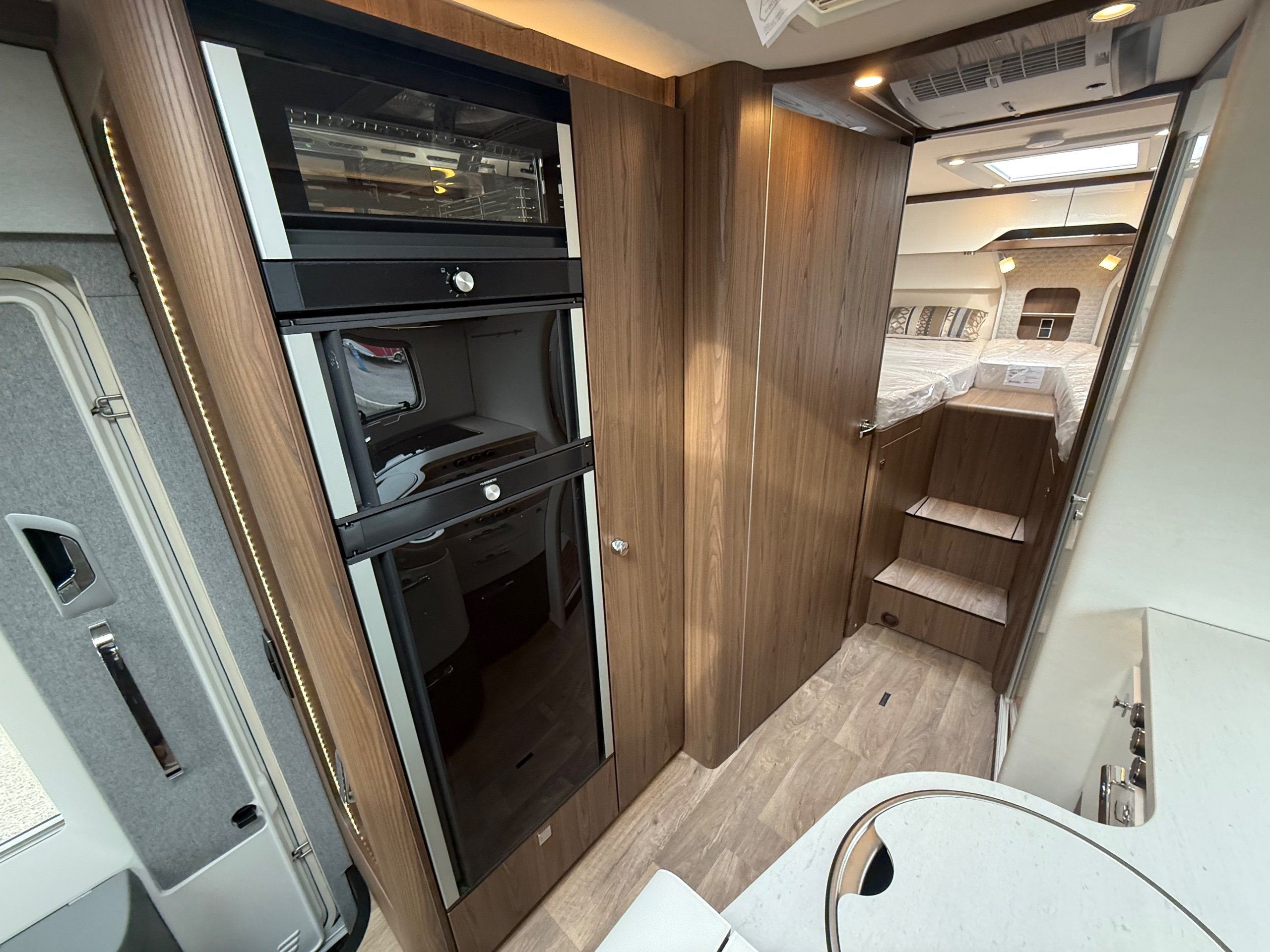 Offering guaranteed quality and technical expertise, the HYMER B-Class MasterLine is setting new standards in the premium segment. As our flagship, it embodies a state-of-the-art body shell design, exclusive design features as well as premium interior furnishings, and creates an all-round generous feeling of space. Following the huge success of the HYMER B-Class MasterLine I, with the HYMER B-ML T we are offering the tried-and-tested features of the luxurious integrated model combined with the exceptional handling characteristics and benefits of a semi-integrated model. Equipped with the nippy Mercedes-Benz chassis cowl, the HYMER B-ML T is the next logical addition to our premium range of motorhomes. Specification • Equipment Line Premium LP • Style package • Living Comfort package • Arctic package • 16" alloy wheels (black) with All Season tyres • 32" LED-TV with built-in speakers, remote control, DVD drive, HYMER Smart • Multimedia system with Bluetooth® (DVB-T / C, DVB-S2), electric bracket as well as receiver • Cab seats, upholstered in living area fabric, swivelling, height- and tilt adjustable with 2 armrests • Carpet: Laguna • Comfort L-shaped seating group with lounge cushions, longitudinal / transverse sliding table and 2 built-in 3-point belts • Comfort jacks, rear (2 units) • Comfort-Plus habitation door incl. closing aid, RFID (keyless) access as well as central locking • Cupholder instead of storage compartment • Drawer and insert tray storage space in seating group • Electric roof vent with function supply and exhaust air at kitchen • Exterior body colour: Crystal-Silver Metallic • Exterior cab colour: Tenorite grey (Metallic) • Four-circuit air suspension (2 axles) • Frame extension incl. 450 kg garage load • Furniture finish: Velvet Ash • Gas filter for automatic gas bottle changeover • HYMER Smart Battery System 2.0 - extension: 2nd habitation battery module 80 Ah LFP incl. additional charger (160 Ah overall capacity) • HYMER panoramic skylight 80 x 50 cm, double-glazed, rear bedroom • Heated windscreen • Mercedes-Benz Sprinter 4.43 t - 417 CDI - 125 KW/170 hp - Euro VI-E • Premium round and extendable table with real wood frame • Roof AirCon, 2,400 W • Roof awning incl. dimmable LED lighting, silver housing, 450 x 300 cm • Security lock for habitation door • Solar panel with solar charge controller (MPPT) and display, 2 x 95 W • TEC-Tower (153 l fridge/freezer unit, oven) • Textile leather-/ fabric combination: Marquis • Weight variant 4,500 kg (Mercedes-Benz Sprinter 415 / 417 CDI only) -